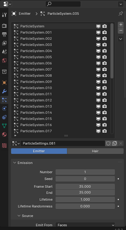 2. 파티클을 36개 생성하여 각각이 하나의 이미지를 생성하도록 만들었다. Emission 개수 1, Frame Start와 End는 같게, Lifetime은 1로 설정하면 한 프레임만 해당 파티클이 나오게 되므로 연속적으로 이미지가 나오는 느낌이 된다.