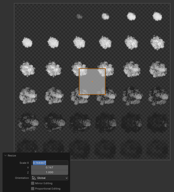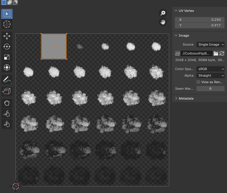 [UV Editing] 모드에서 UV를 연기 하나에 맞게 위치와 스케일을 조정해야 한다.