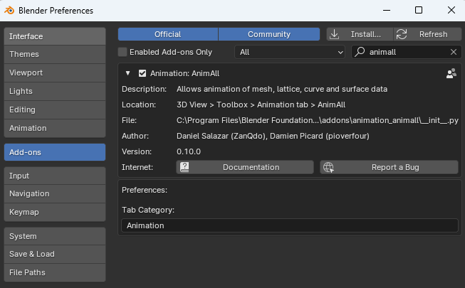 Addon 검색에서 "AnimAll"을 검색하여 추가한다.