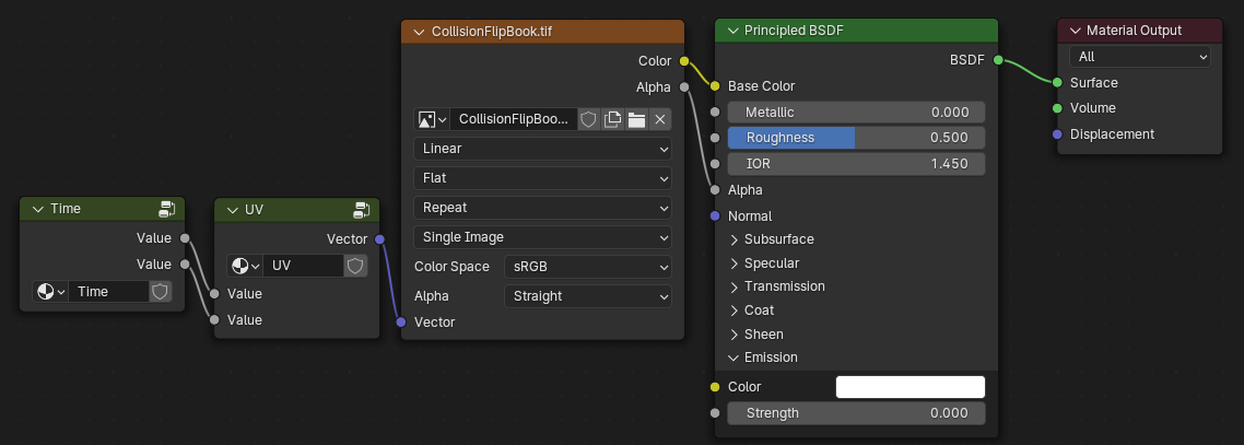 애드온을 사용하지 않는 방법으로는 위 유튜버가 올린 블렌더 첨부파일에서 셰이더 노드를 Append 하여 [Time] 노드와 [UV] 노드를 가져와서 텍스쳐에 연결하는 방법이 있다.