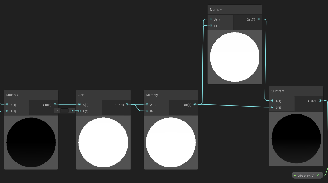 - 곱한 후에는 오브젝트 Y 값에 1을 더한 후 제곱을 한다. 네제곱을 한 부분에서 제곱을 한 부분을 [Subtract]로 빼면 그 차이 만큼에 있는 오브젝트에 효과를 준다는 말이다. (1보다 큰, 네제곱된 수 - 제곱된 수)