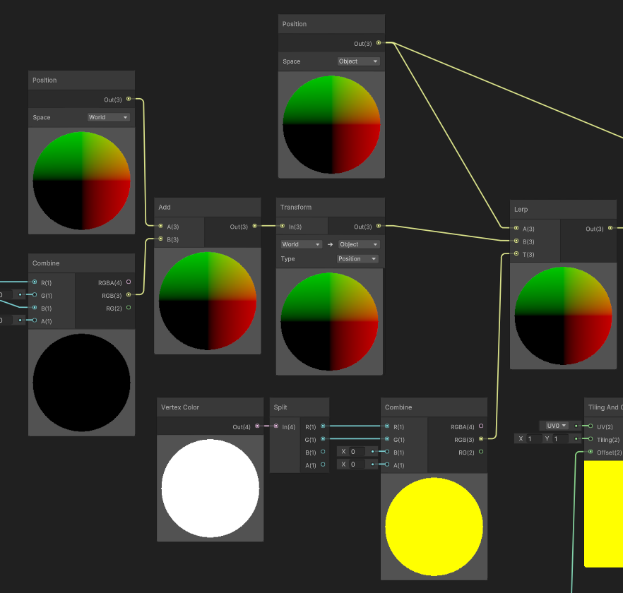 - 파란색을 제외한 [Vertex Color] 노드를 [Combine]을 이용해 [Lerp]의 Factor로 연결한다.