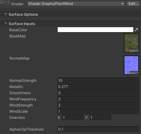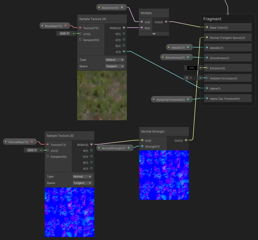여기서, 노말의 [Sample Texture 2D] - [Type] - [Normal]로 설정을 해야 노말맵으로 인식해서 잘 들어간다. - 나머지 프로퍼티는 Metallic, Smoothness, AlphaClipThreshold로 원하는 값을 넣을 수 있게 했다.