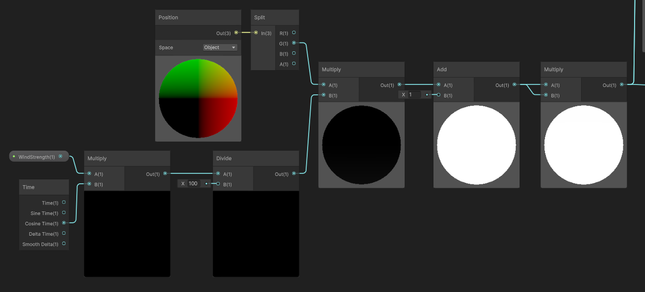 - Cosine 시간을 100으로 나눈 값을(값이 너무 커지는 것을 방지) 오브젝트의 Y 포지션 값에 곱한다. 여기까지 본다면 Y축을 따라서 늘어났다 줄어들었다 하는 셰이더라는 것을 알 수 있다. 아래의 gif처럼 이 상태로도 오브젝트의 [Position]에 [Add]하면 바로 사용할 수 있다. (코드로 따지면 transform.position += transform.position * 2 의 느낌과 같다고 생각된다. 물론 이런식으로 쓰진 않지만)