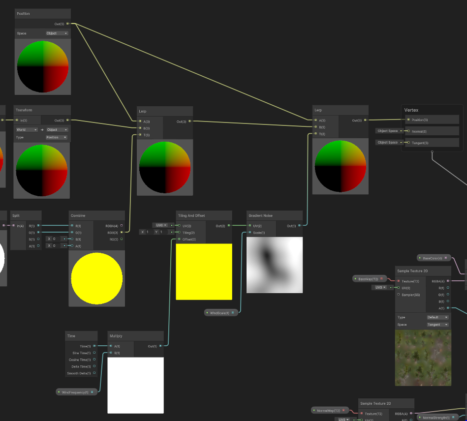 - Bush BaseMap 텍스쳐를 [Sample Texture 2D] 노드로 가져왔고 색을 수정해야할 오브젝트가 있어서 [BaseColor] 프로퍼티를 만들어 곱한 후 [Base Color]에 연결했다.