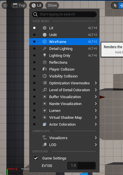 Orthographic 뷰 : 왼쪽 상단에서 선택할 수 있다. 마우스 오른쪽 버튼으로 2D 뷰 이동. Lit/Wireframe으로 전환해서 볼 수 있다.