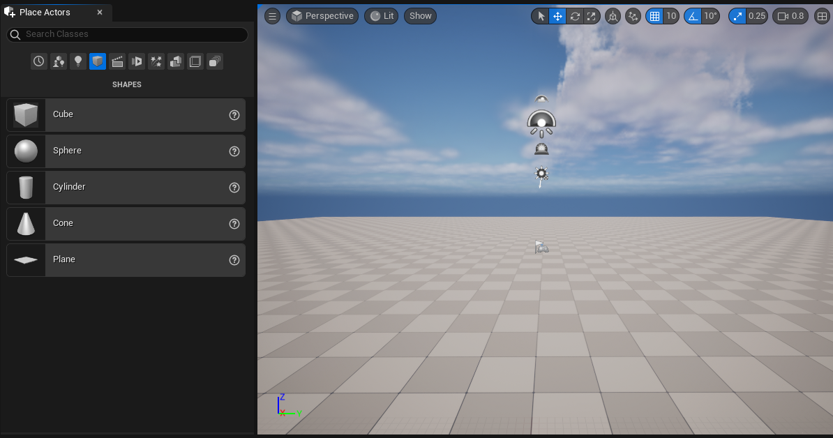 좌측엔 오브젝트의 모음인 뜻하는 [Place Actors] 창이 있다.