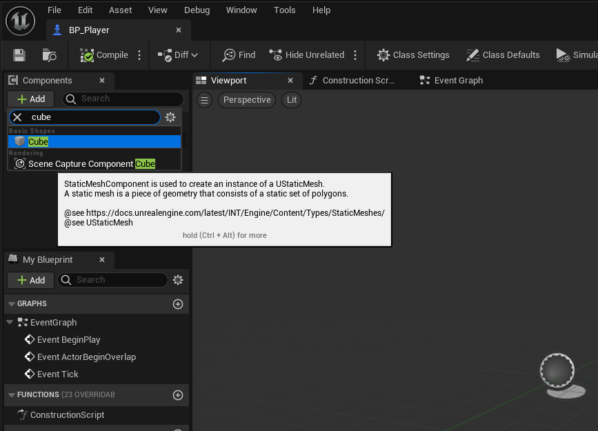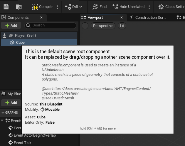 Cube를 끌어서 올리면 RootComponent가 된다. 가상적으로 물리를 체크하기 위해서 사용되기도 함.