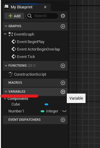 블루프린트 왼쪽 [My Bluprint] - [VARIABLES]에서 + 버튼을 눌러 컴포넌트를 추가할 수 있다.