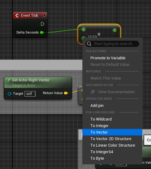 [Event Tick] 노드에 Muliply 노드 연결 후 숫자 부분에서 마우스 우클릭, [To Vector] 선택.