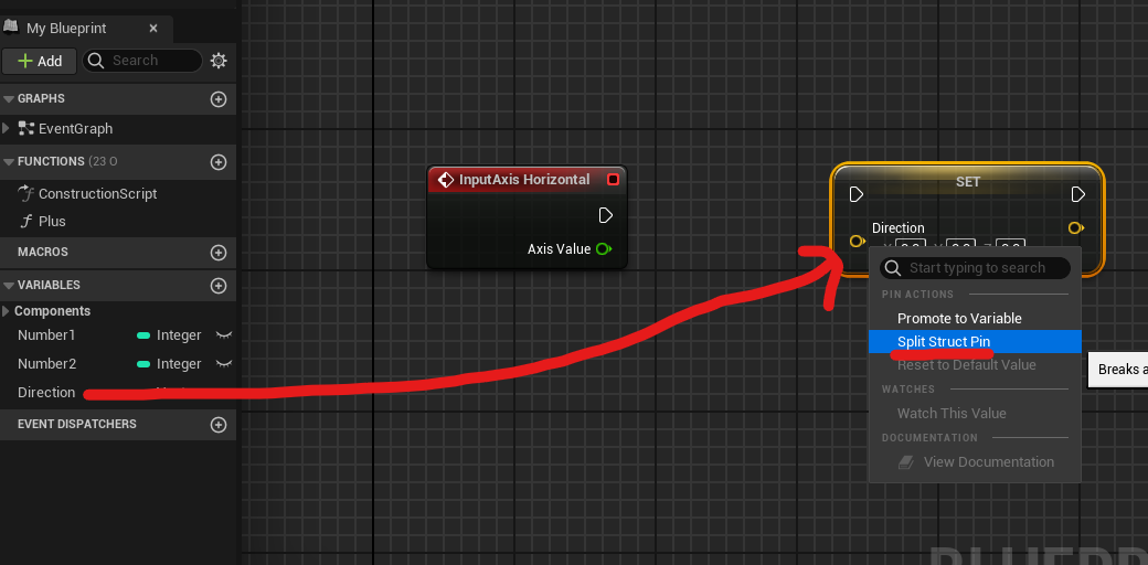 [Direction] 컴포넌트를 Set으로 가져오고 Y, Z에 다른 입력을 넣어야 하기 때문에 우클릭 후 [Split Struct Pin] 선택.
