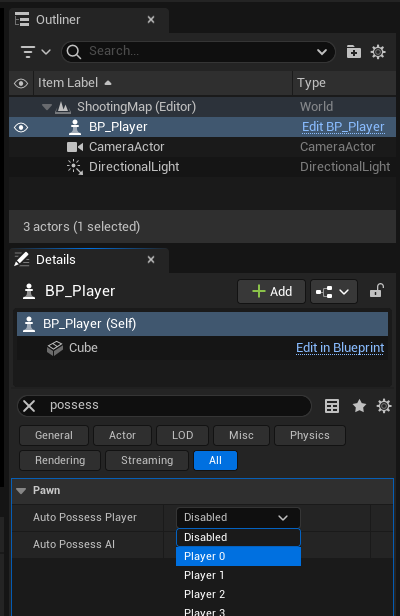 possess를 해야하기 때문에 [Detail] 창에서 [Auto Possess Player] - [Player 0]으로 설정한다.