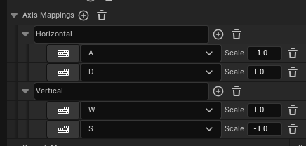 [Axis Mappings] 부분 설정은 아래와 같다. 수평 이동을 위한 "A", "D"입력, 수직 이동을 위한 "W", "S"입력.