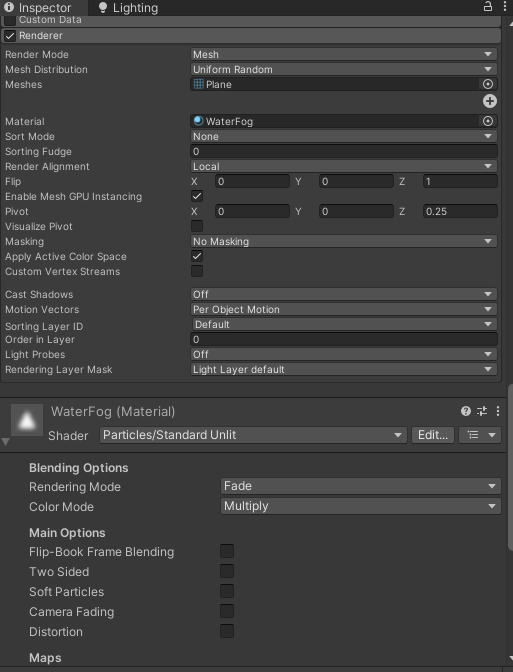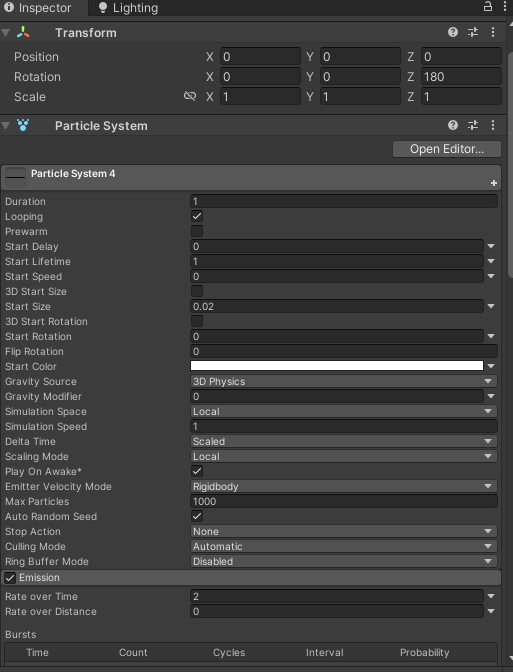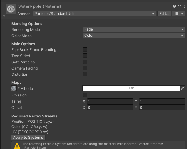 [Material] : 위에서 [Particles/Standard Unlit], [Fade]로 설정된 메테리얼을 넣는다.