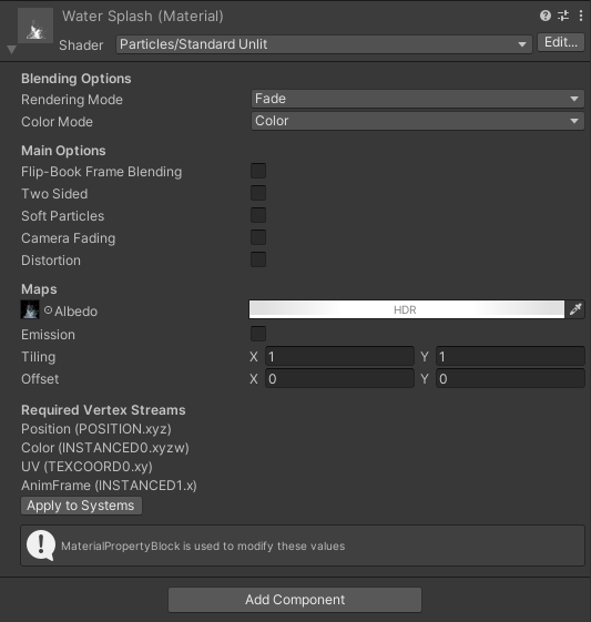 파티클 용도의 메테리얼이기 때문에 [Particles/Standard Unlit] 셰이더를 사용했다.