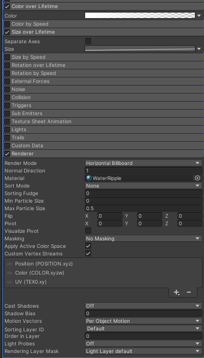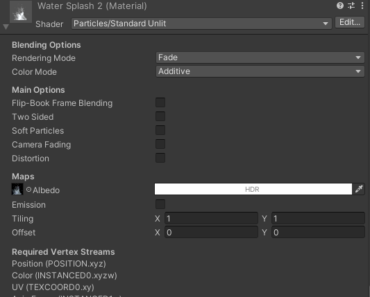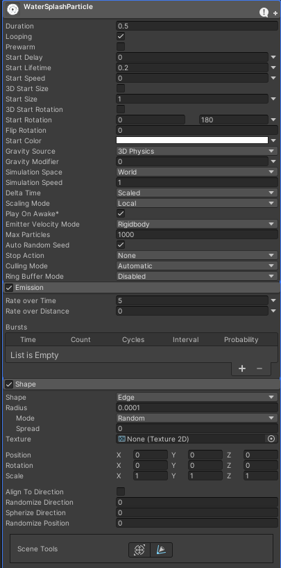 물 스플래시 효과의 Particle System 설정과 메테리얼 설정은 아래와 같다.