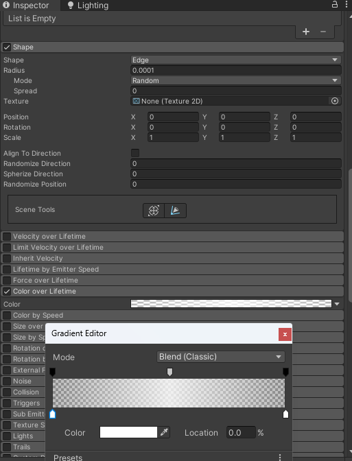 [Color over Lifetime] : 끝으로 갈 수록 알파 값을 낮춰 점점 투명해지도록 설정.