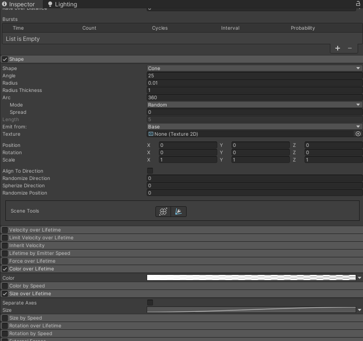 [Shape] - [Cone] : 원뿔 모양의 Emitter로 반지름을 작게하여 살짝씩 회전 랜덤을 넣었다.