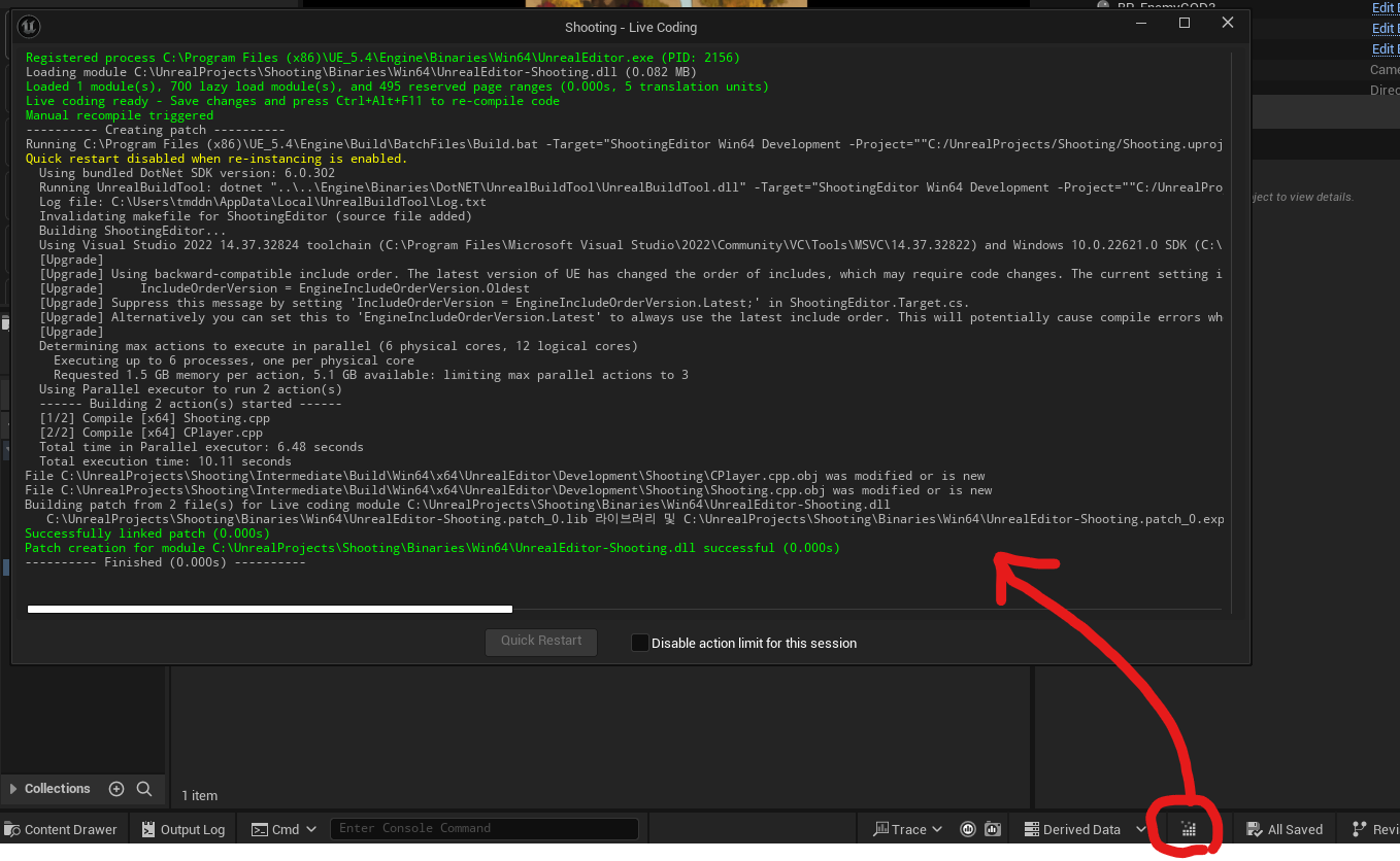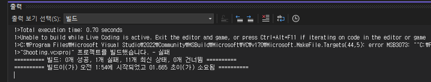 Visual Studio에서 Ctrl+B로 빌드하면 Live Coding이 활성화 되어 있어서 오류가 뜬다고 나온다.