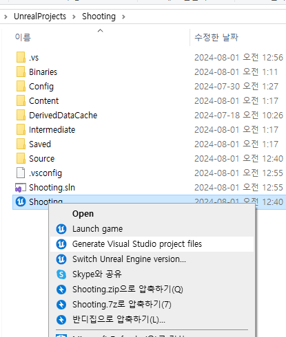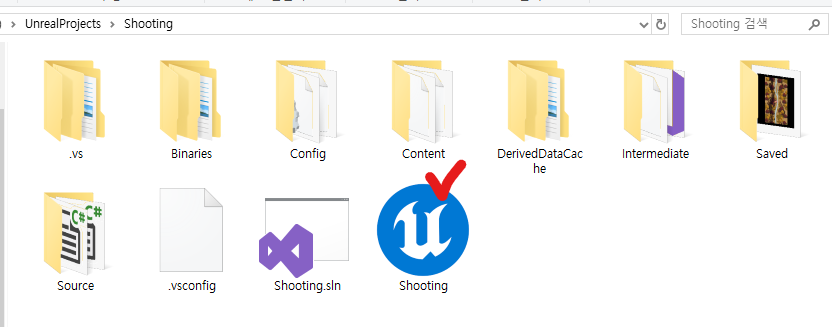 에디터를 끄고 파일 경로로 가서 Shooting 언리얼 프로젝트 파일을 연다.