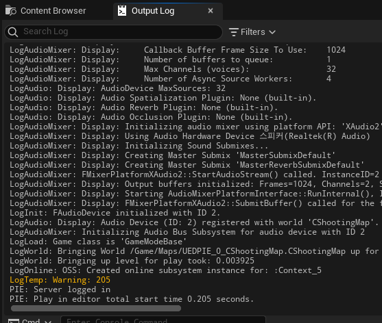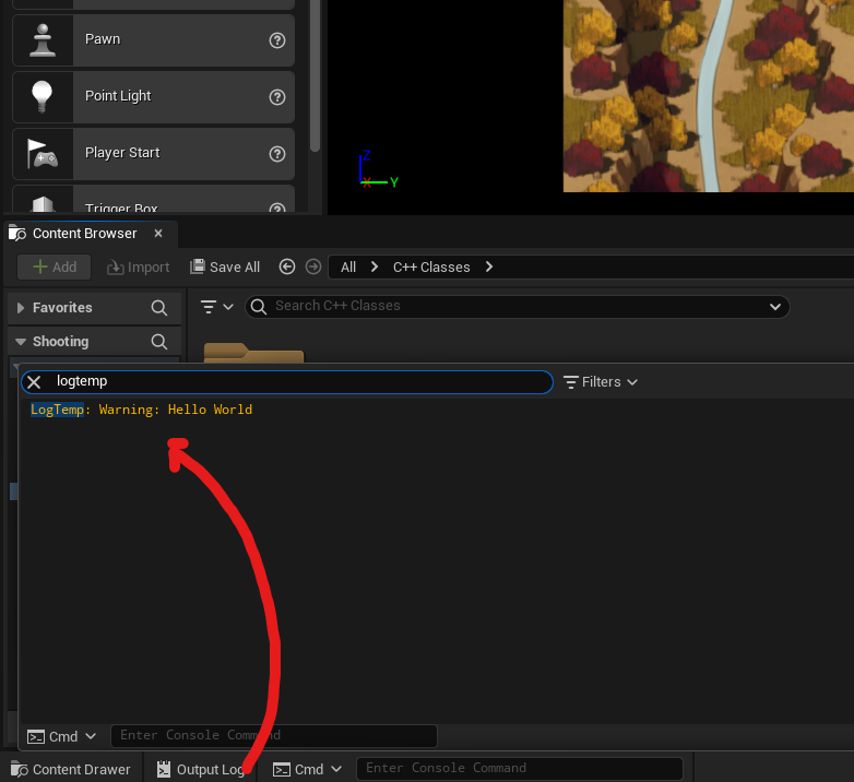 [Output Log]에서 "logtemp" 검색하면 "Hello World"가 출력되어 있는 것을 볼 수 있다.