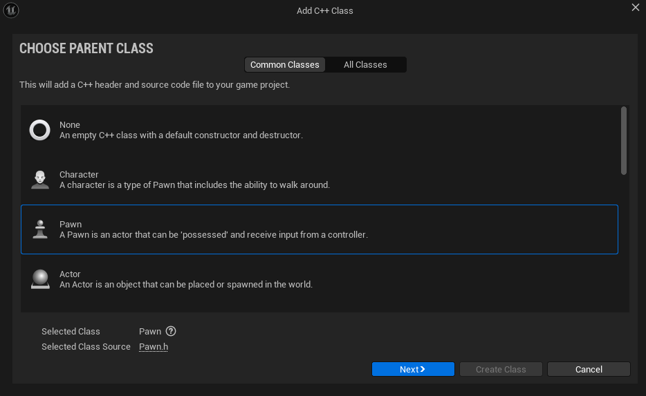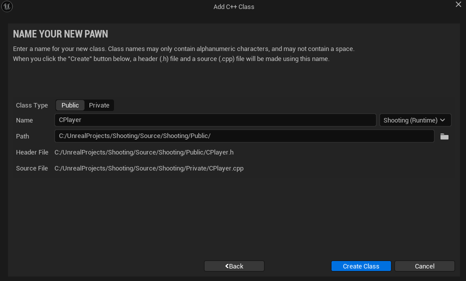 [Class Type] - [Public]으로 설정하고 "CPlayer" 이름으로 생성한다.