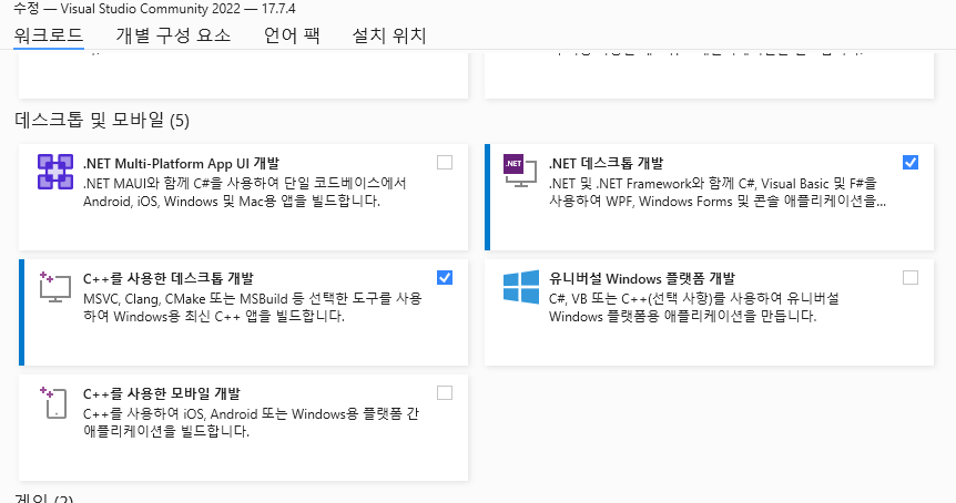 Visual Studio Installer 설정이 되어있지 않아서 오류가 발생했다. 설정은 아래와 같다.