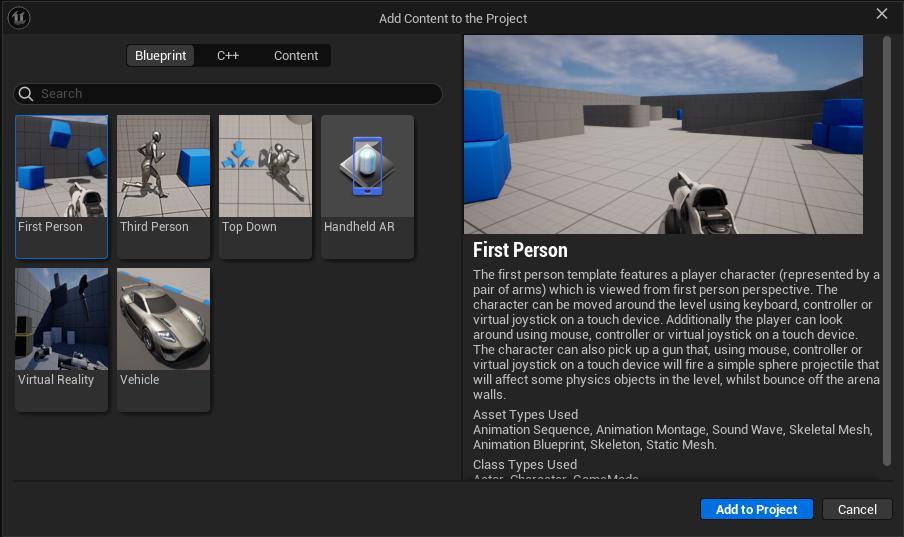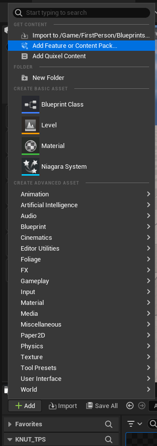 [Add] - [Add Feature or Content Pack...]으로 First Person 프로젝트를 가져온다.