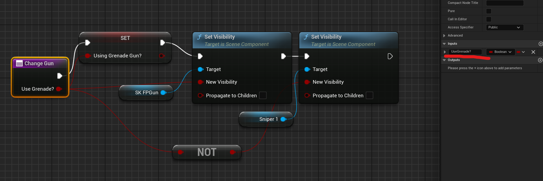 만든 함수 안으로 들어가서, 오른쪽에 Inputs에 UseGrenade? Boolean을 하나 만들고 같은 체크박스를 받는 노드를 연결한다. NOT은 ! 검색으로 연결했다.