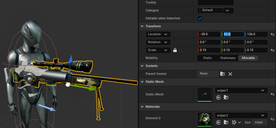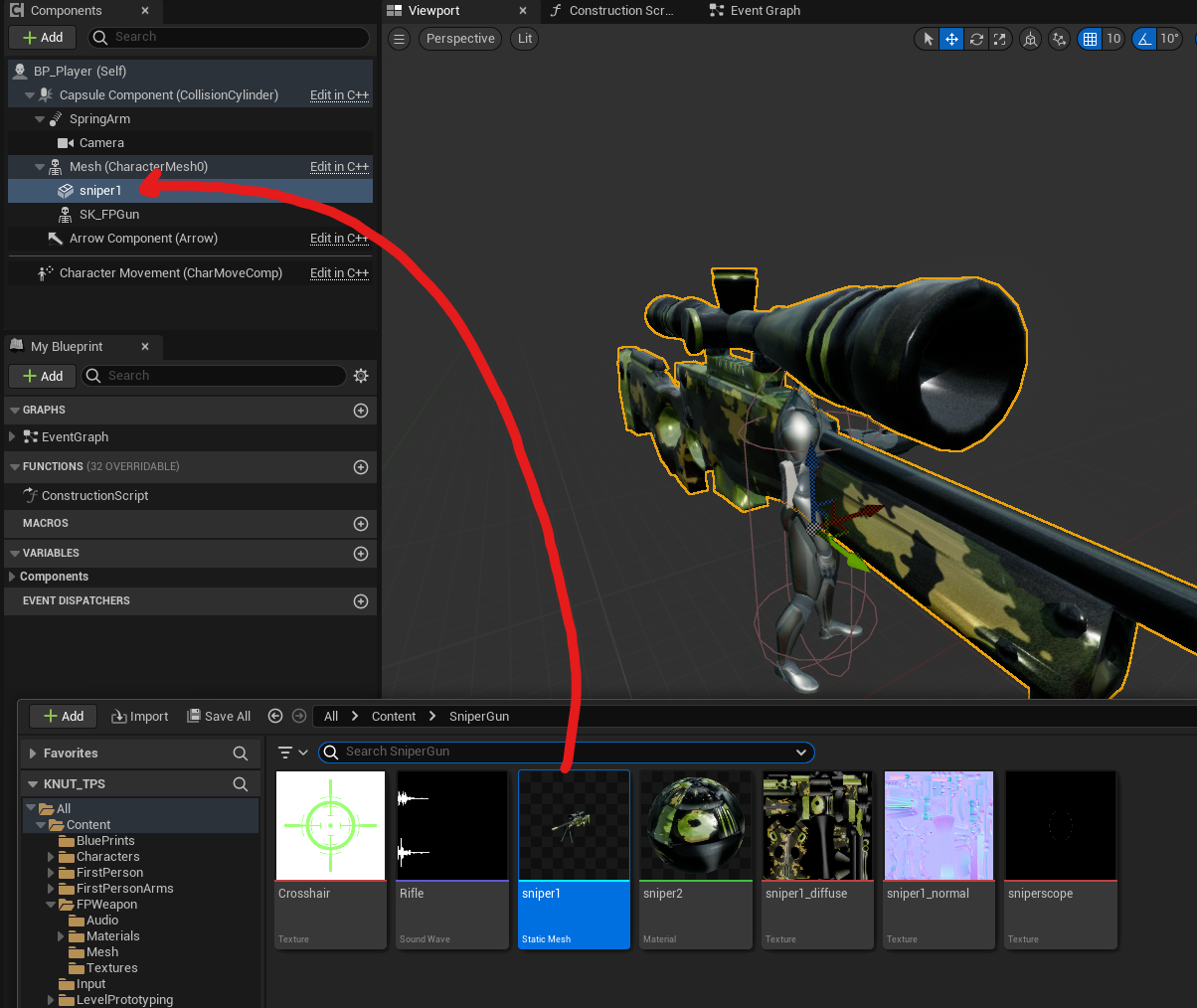 BP_Player에 sniper 총 메쉬를 Mesh 하위에 넣는다.