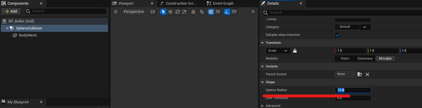 SphereCollision의 [Sphere Radius]를 13으로 설정해서 콜라이더가 메쉬를 감싸도록 설정했다.