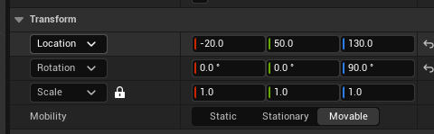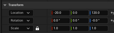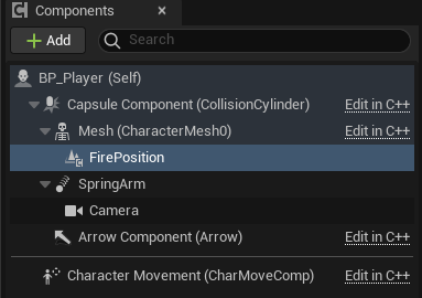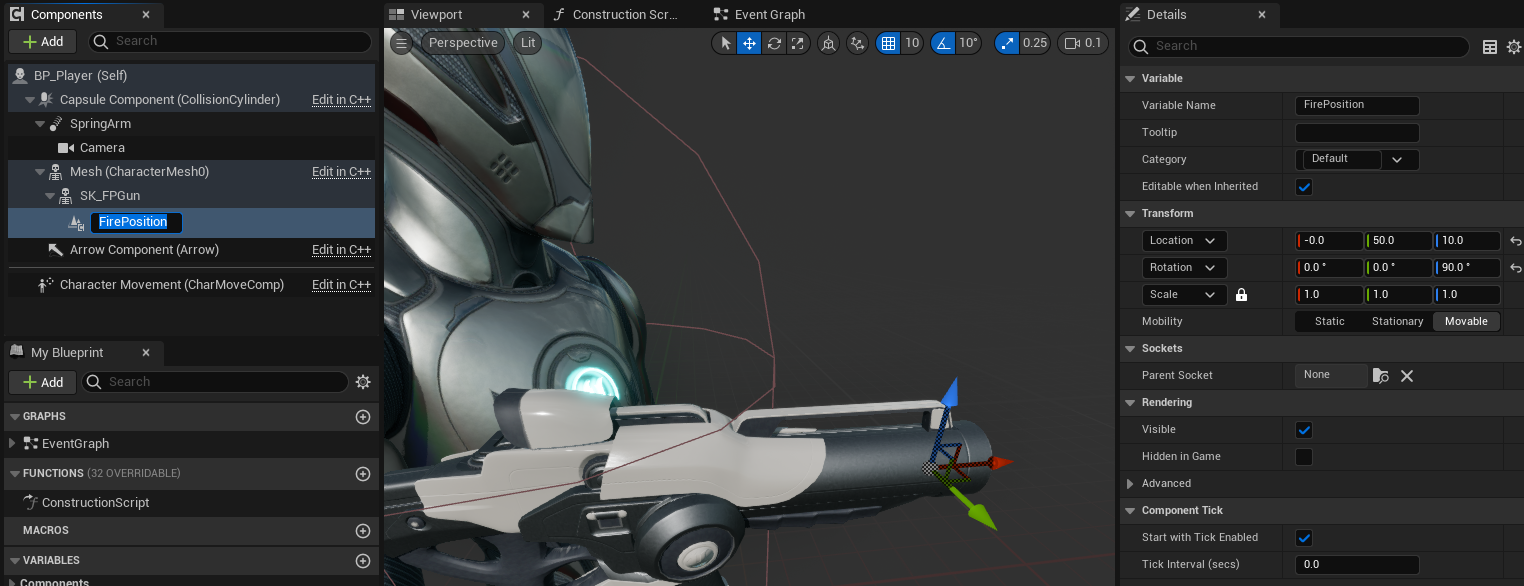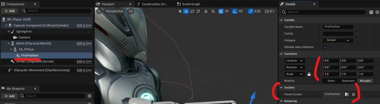 다시 블루프린트로 돌아와서, FirePosition을 선택했을 때, [Parent Socket]을 FirePosition으로 설정하면 Transform을 전부 0으로 놓으면 방금 설정했던 자리로 옮겨진다.