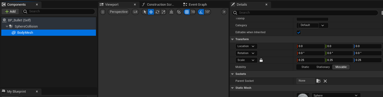 크기 조절을 위해서 BodyMesh의 Scale은 0.25로 맞추었다.