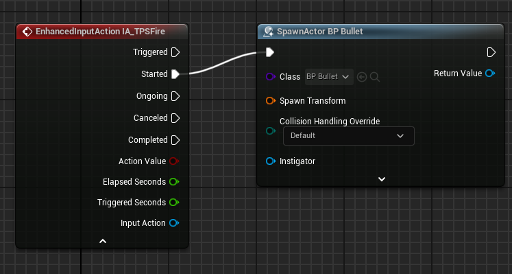 BP_Player로 와서, IA_TPSFire를 검색해서 노드 추가, Spawn Actor from Class 검색해서 노드 추가한 후 [Started] 노드를 연결한다. BP_Bullet class를 생성하도록 설정했다.