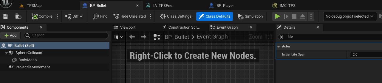 BP_Bullet에서 [Details]에 life를 검색하면 [Initial Life Span]이 있다. 2.0으로 설정하면 2초 후 사라진다.