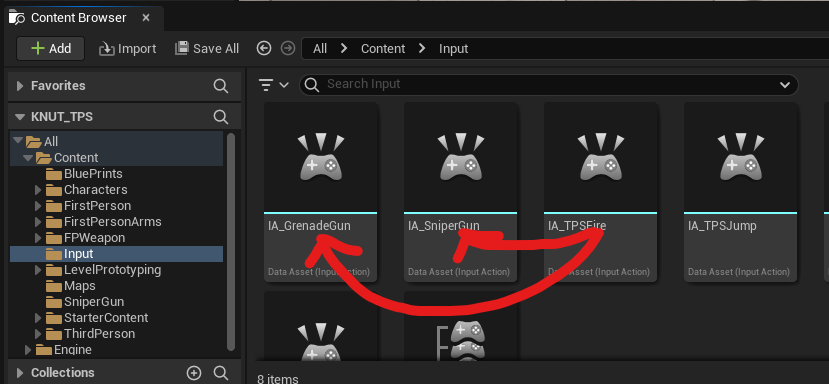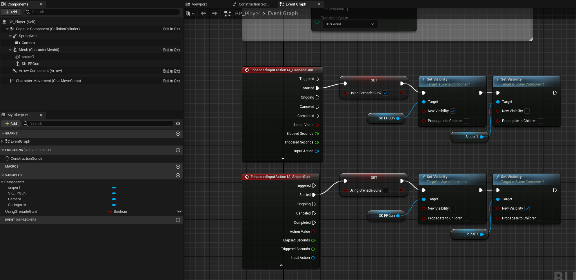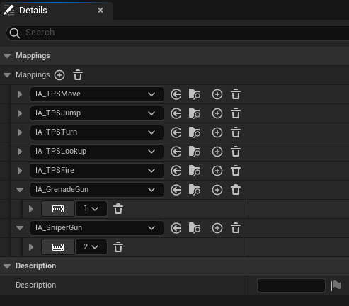 IA_TPSFire를 복제하여 IA_GranadeGun, IA_SniperGun을 만들었다. 키보드 1번은 GrenadeGun, 2번을 누르면 SniperGun이 나오도록 설정한다.