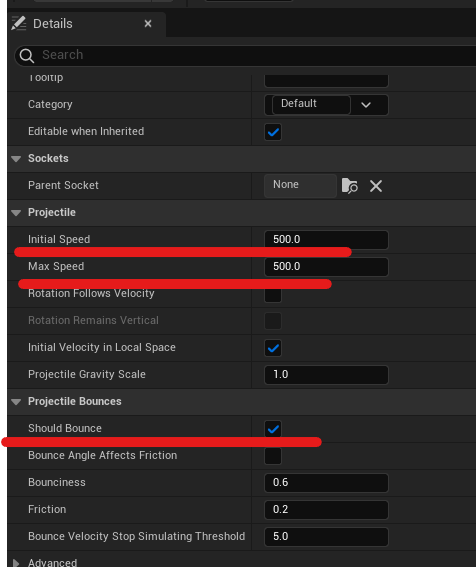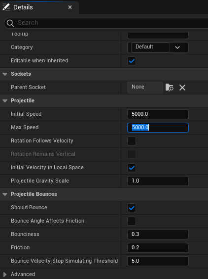 하지만 이렇게 하면 총알 느낌이 나지 않기 때문에 5000으로 높이고 Bounciness를 0.6에서 0.3으로 줄였다.