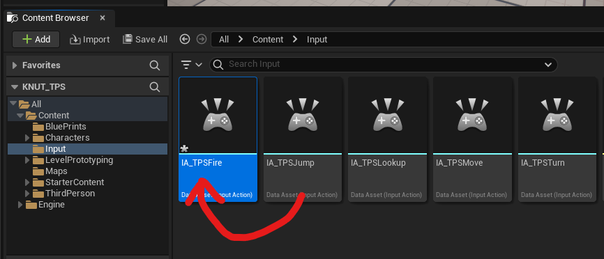 총알 발사하는 Input도 Jump 처럼 단발성 입력이기 때문에 IA_TPSJump를 복제하여 IA_TPSFire를 만들었다.