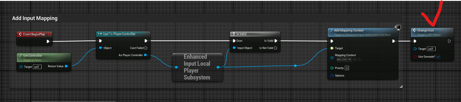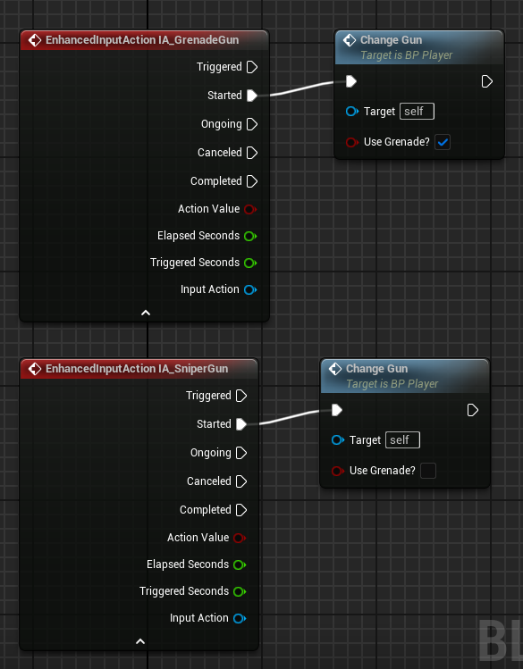 BeginPlay 맨 뒤에 만든 함수를 연결하면 초기 설정으로 GrenadeGun 또는 SniperGun을 선택할 수 있다.