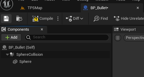 블루프린트를 더블클릭하여 들어가서 Sphere 메쉬를 추가하고, Sphere Collision을 추가하여 Sphere Collision은 마우스로 드래그해서 Root Component로 만들었다.