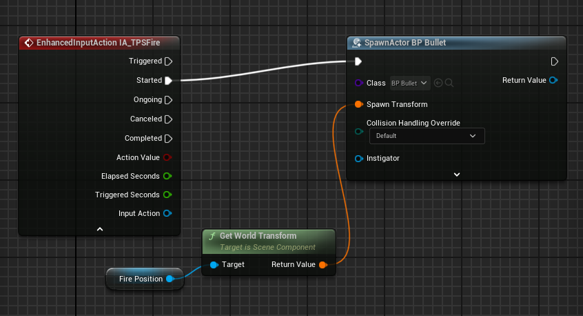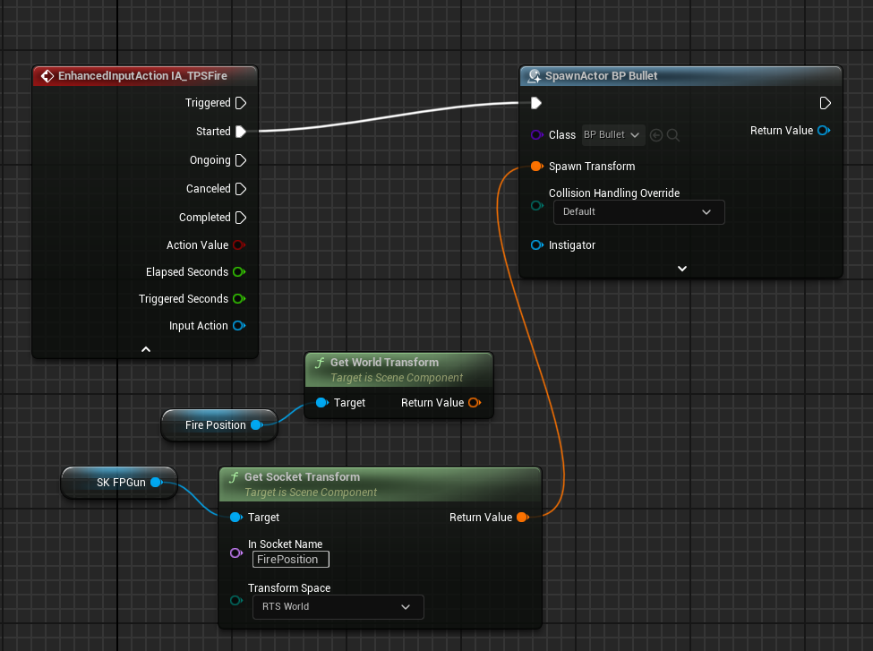 FirePosition을 가져와서 World Transform으로 위치 값을 전달하면 총알이 잘 생성된다.