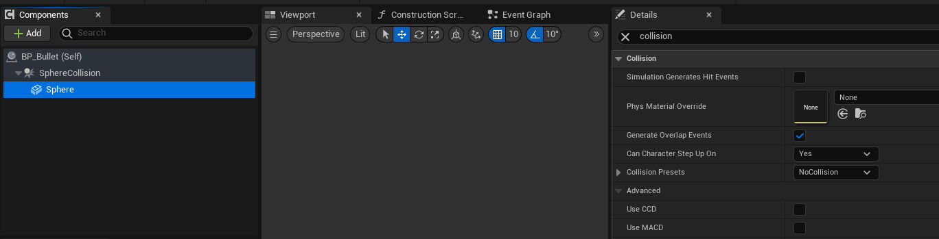 그 밑에 Sphere 메쉬에게는 [NoCollision]으로 설정하여 같은 블루프린트 내에서 충돌이 일어나지 않게 한다.