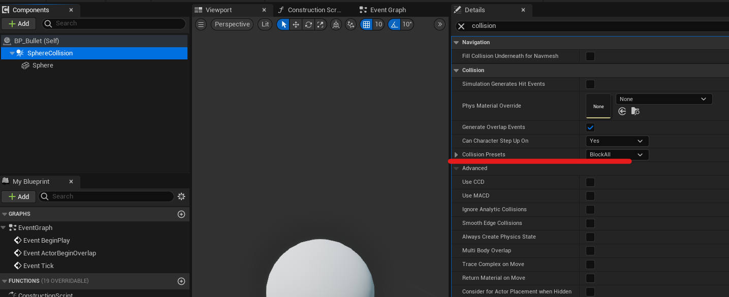 SphereCollision의 [Collision Presets]는 [BlockAll]로 설정