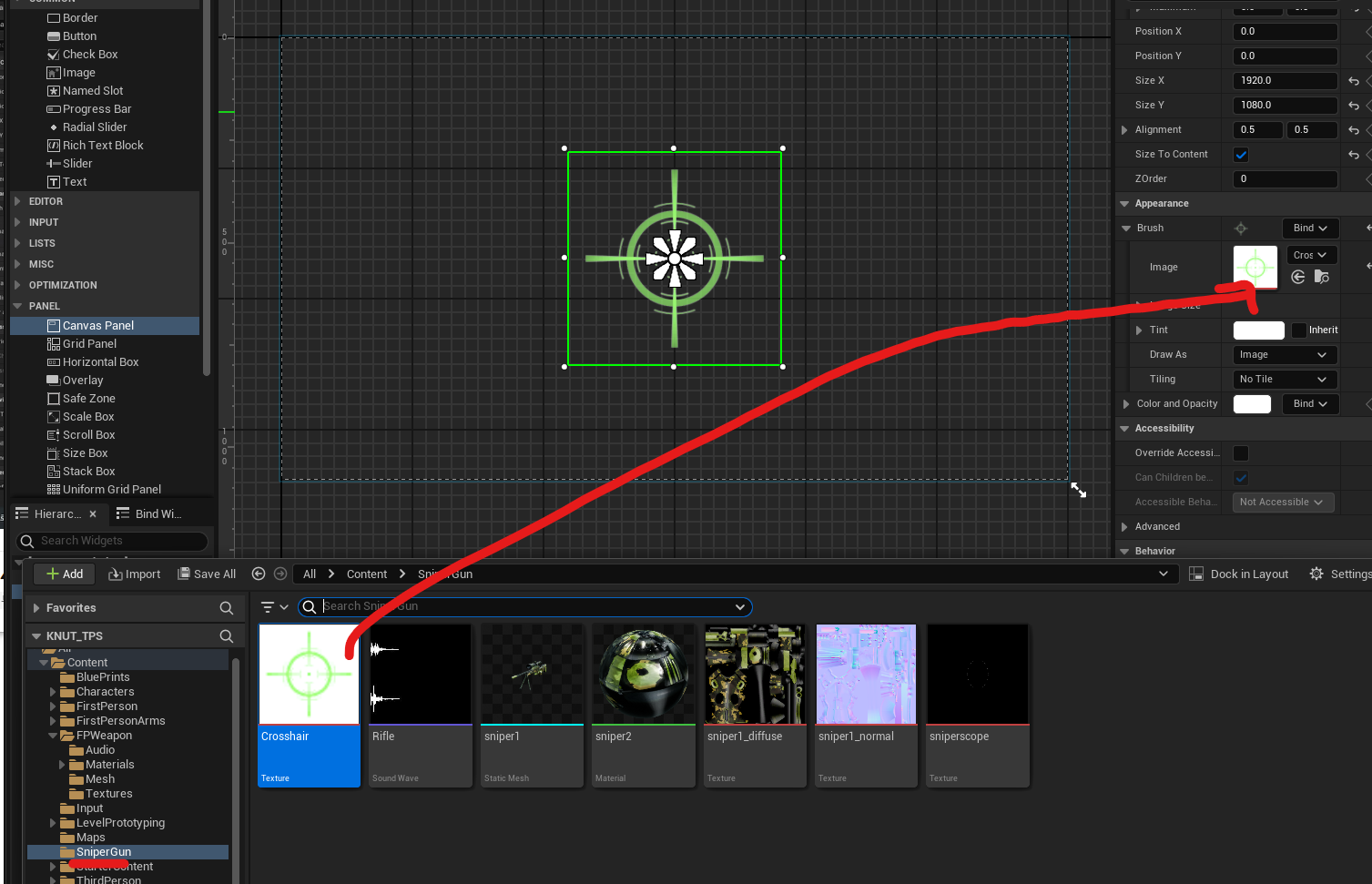 WBP_CrosshairUI에 들어가서 Image에 크로스헤어 이미지를 드래그해서 넣는다.