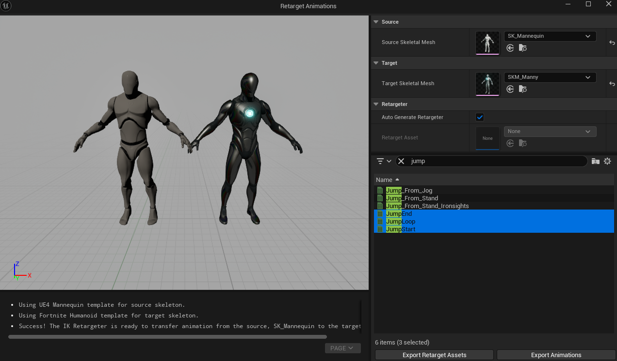 다른 애니메이션도 Retarget으로 가져오기 위해서 아무 애니메이션 우클릭 - [Retarget Animations] 메뉴를 열어준 후 Jog와 Walk에 해당하는 애니메이션을 export 하였다.