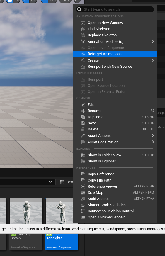 원하는 애니메이션을 우클릭, [Retarget Animations]를 누른다.