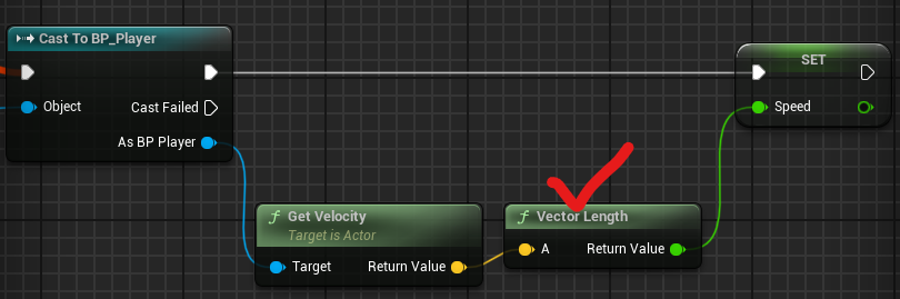 Pawn Owner로 BP_Player를 설정해주고, 속도를 받아서 Speed와 연결시켜주는데 벡터와 스칼라의 연결이므로 가운데에 벡터 크기로 스칼라를 구해서 연결했다.