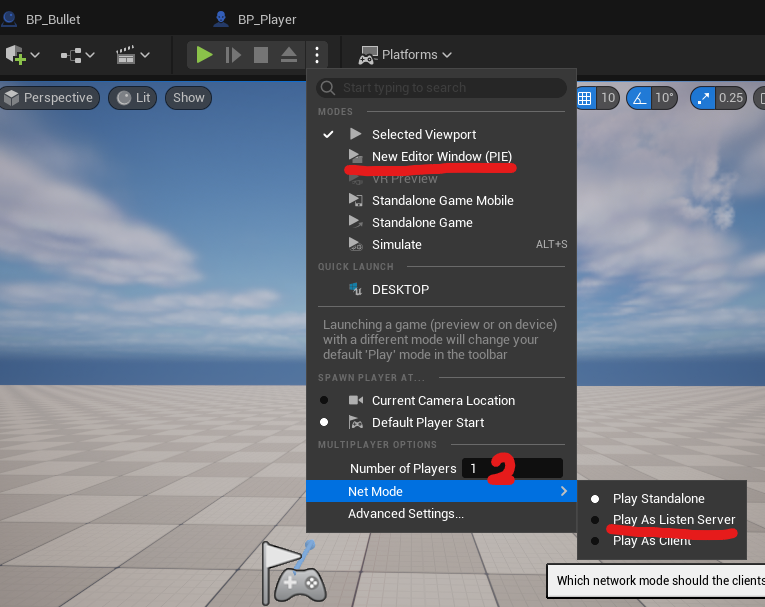 멀티로 실행하기 위해서는 [New Editor Window (PIE)]로 변경, [Number of Players] 2로 설정, [Play As Listen Server]로 변경하면 두 개의 창으로 멀티플레이처럼 플레이할 수 있다.