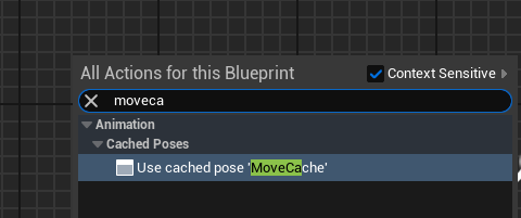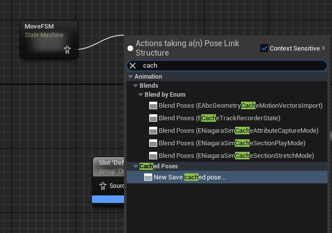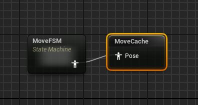 MoveFSM을 캐싱해서 변수처럼 쓰려고 한다. "cache"를 검색해서 [New Save cached pose...] 노드 연결하고 "MoveCache"로 이름을 바꿨다.