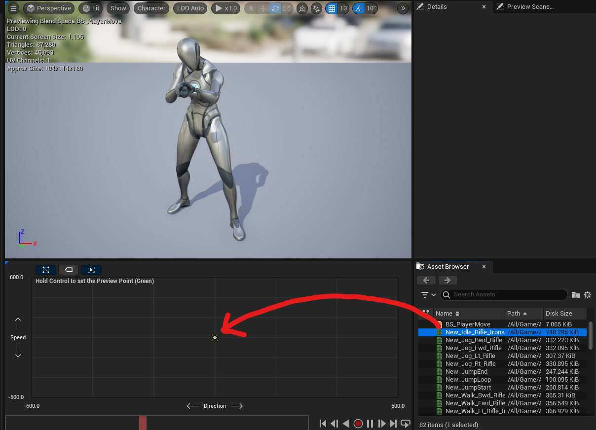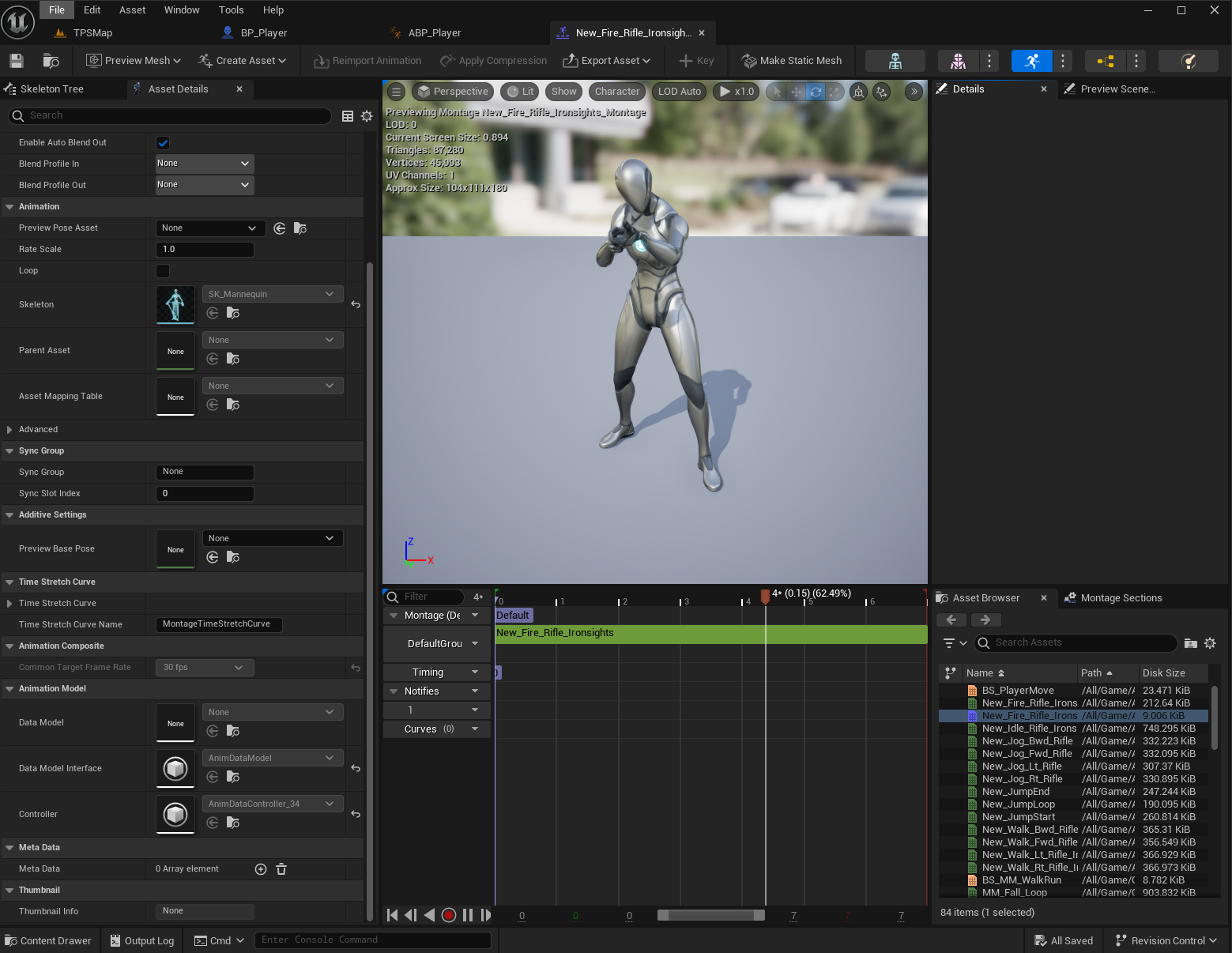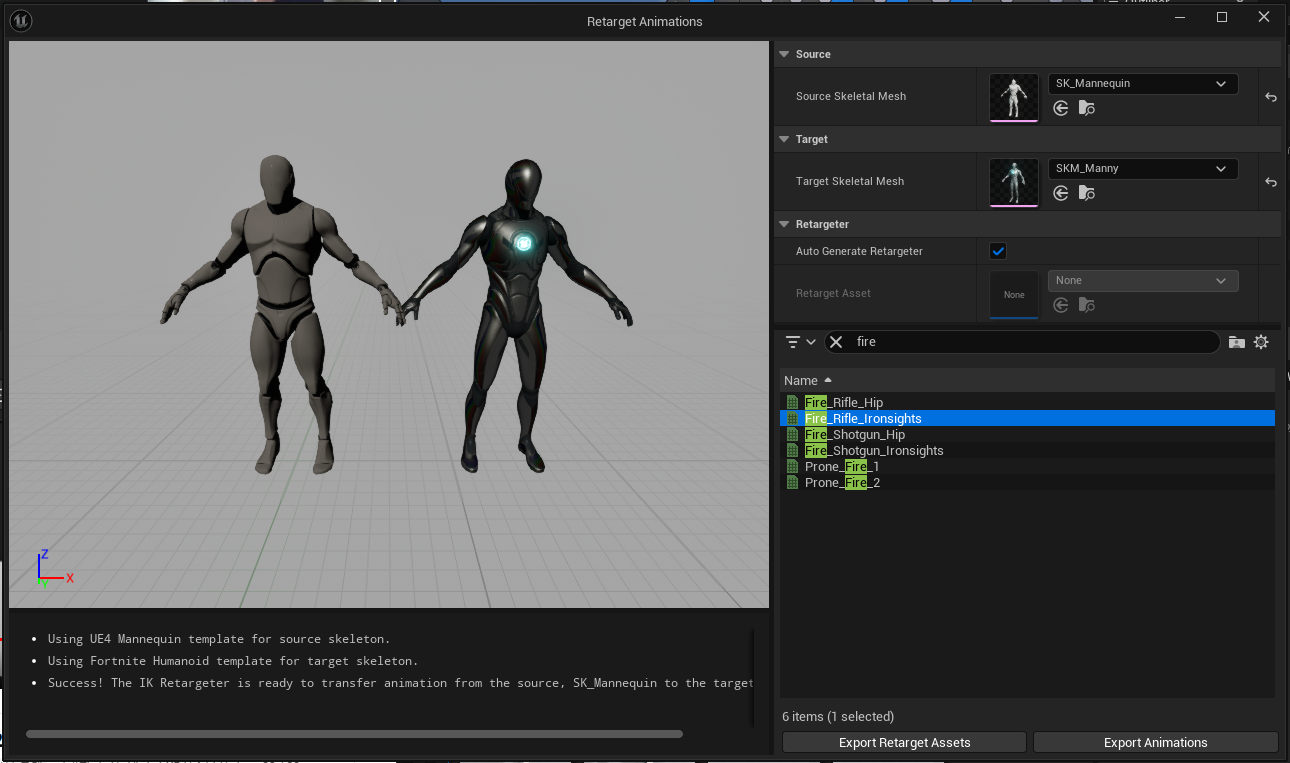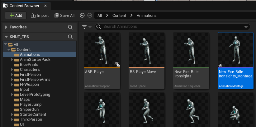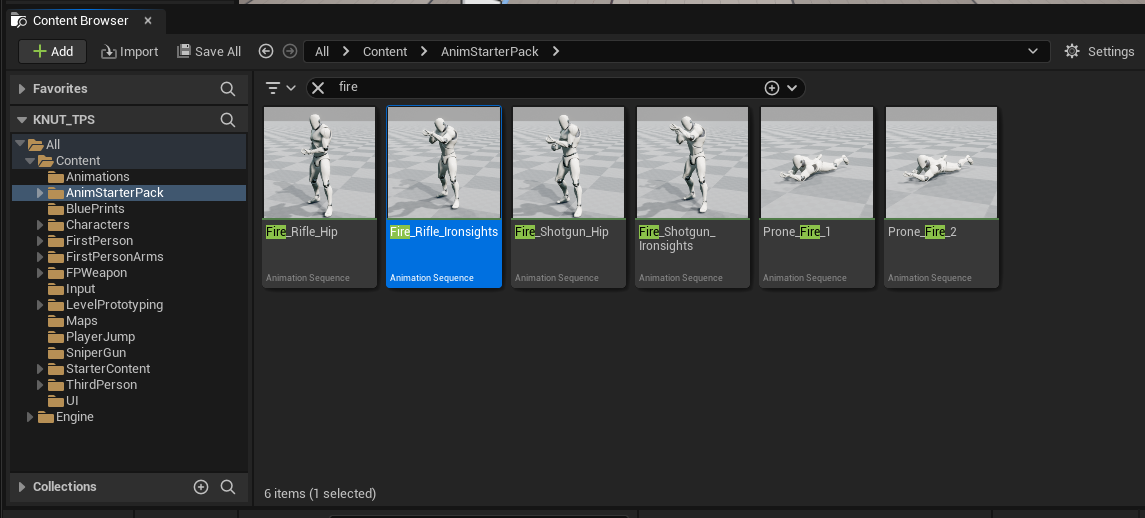 AnimStarterPack 안에 있는 "Fire_Rifle_Ironsights" 애니메이션을 Retarget하여 가져온다.
